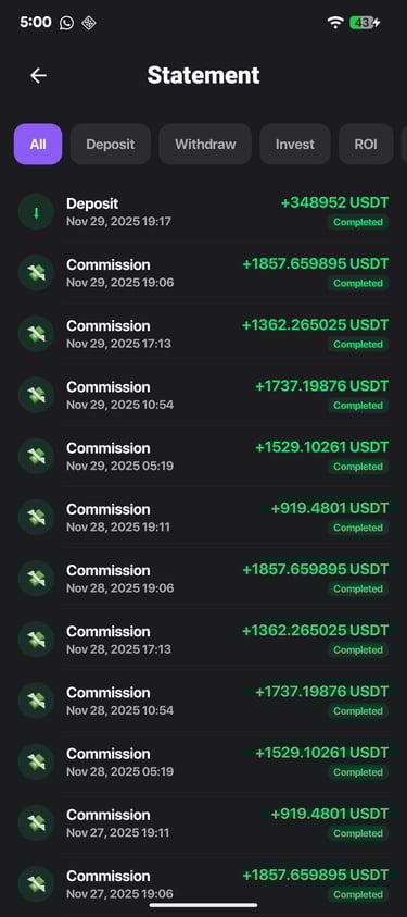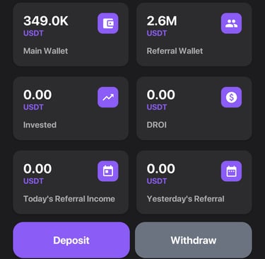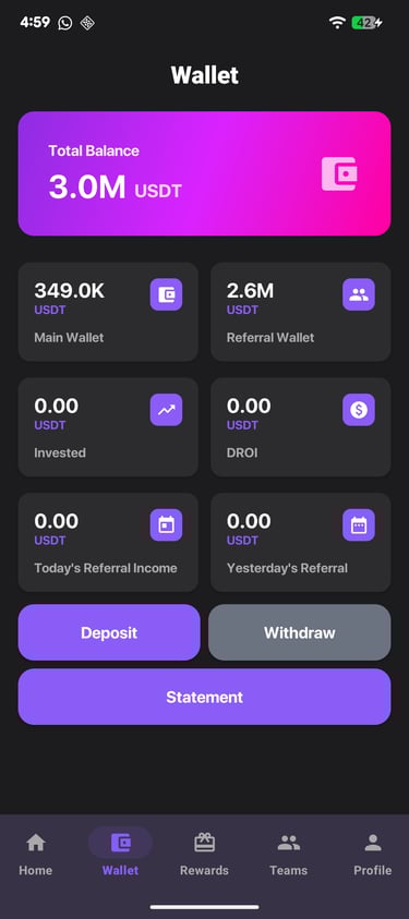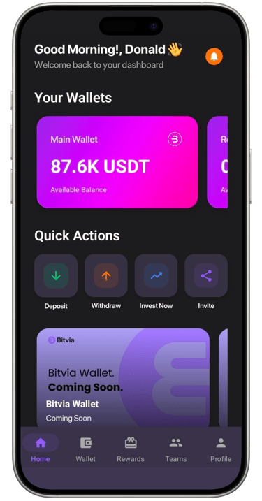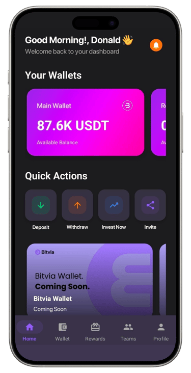 Once Bitvia’s AI models secure profitable outcomes, returns are processed and allocated back into the system. Users receive their ROI directly in their Main Wallet as per their chosen plan, while eligible referral and team-based earnings are distributed simultaneously. The entire cycle is automated, transparent, and fully trackable inside the app.